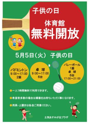 - 体育館利用不可のお知らせ(2026.2.10更新)イベント開催・点検の為、体育館の利用ができません。大変ご迷惑おかけ致しますがご理解ご協力の程、よろしくお願いいたします。