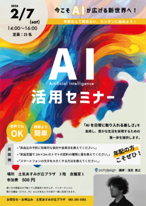 「AIを日常に取り入れる楽しさ」を実感し、豊かな生活を実現するための第一歩!年齢なんて関係ない!カンタンに始めてみませんか? 2月7日(土)14:00~16:00 会議室1 参加費500円