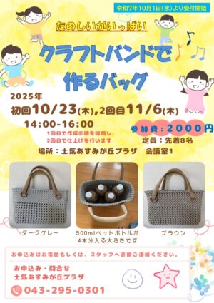 クラフトバンドでバッグを作ってみませんか? 全2回コース 初回10月23日(木)・2回目11月6日(木) 14:00~16:00 500mlペットボトルが4本入る大きさのバッグを作ります。色は2種類、ダークグレー、ブラウ […]