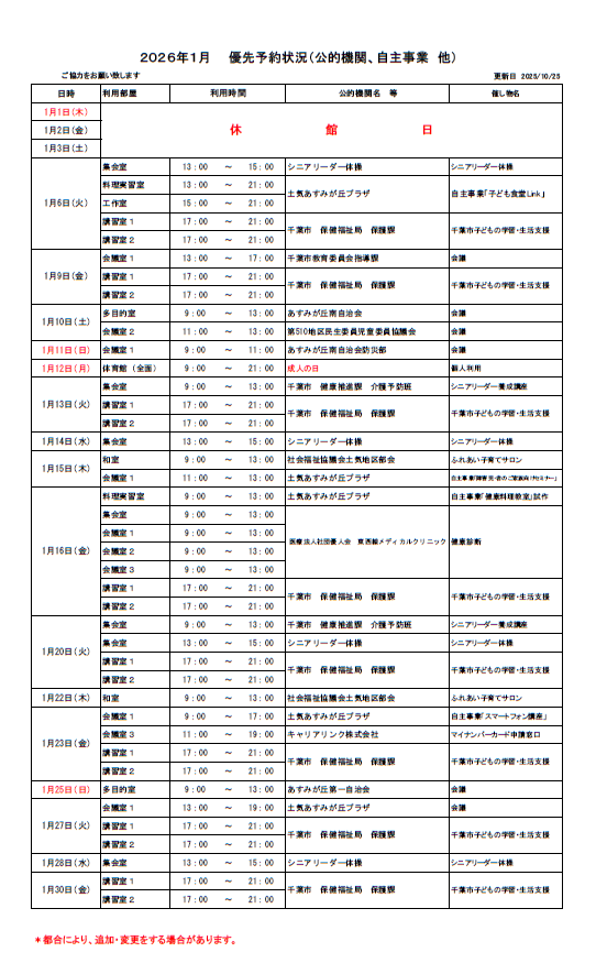 土気あすみが丘プラザ2026年1月の優先予約状況を公開いたします。1月の抽選予約をお申し込みされる際はご確認をお願いいたします。(※更新日現在の優先予約状況となります。特段の事情等により追加、もしくは変更となる場合がございますので、予めご了承願います。詳しくは、当プラザまでお問い合わせください。) 下のリストが見づらい場合は、こちらのPDF版をご覧ください。⇒ 優先予約2026.1pdf