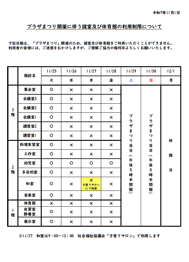 プラザまつり開催に伴う諸室及び体育館の利用制限について