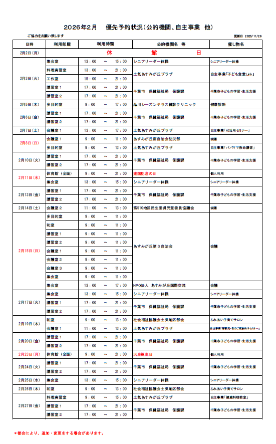 土気あすみが丘プラザ2026年2月の優先予約状況を公開いたします。2月の抽選予約をお申し込みされる際はご確認をお願いいたします。(※更新日現在の優先予約状況となります。特段の事情等により追加、もしくは変更となる場合がございますので、予めご了承願います。詳しくは、当プラザまでお問い合わせください。) 下のリストが見づらい場合は、こちらのPDF版をご覧ください。⇒ 優先予約2026.2pdf