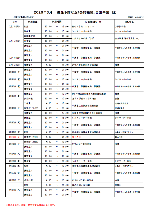 土気あすみが丘プラザ2026年3月の優先予約状況を公開いたします。3月の抽選予約をお申し込みされる際はご確認をお願いいたします。(※更新日現在の優先予約状況となります。特段の事情等により追加、もしくは変更となる場合がございますので、予めご了承願います。詳しくは、当プラザまでお問い合わせください。) 下のリストが見づらい場合は、こちらのPDF版をご覧ください。⇒ 優先予約2026.3pdf