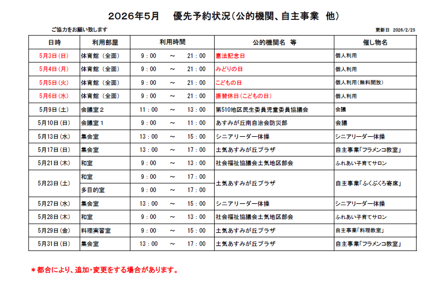 土気あすみが丘プラザ2026年5月の優先予約状況を公開いたします。5月の抽選予約をお申し込みされる際はご確認をお願いいたします。(※更新日現在の優先予約状況となります。特段の事情等により追加、もしくは変更となる場合がございますので、予めご了承願います。詳しくは、当プラザまでお問い合わせください。) 下のリストが見づらい場合は、こちらのPDF版をご覧ください。⇒ 優先予約2026.5pdf