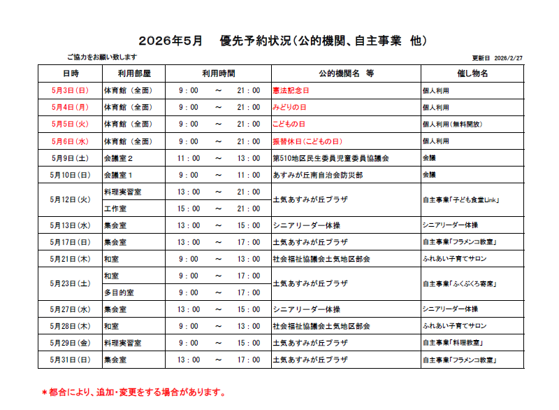 土気あすみが丘プラザ2026年5月の優先予約状況を公開いたします。5月の抽選予約をお申し込みされる際はご確認をお願いいたします。(※更新日現在の優先予約状況となります。特段の事情等により追加、もしくは変更となる場合がございますので、予めご了承願います。詳しくは、当プラザまでお問い合わせください。) 下のリストが見づらい場合は、こちらのPDF版をご覧ください。⇒ 優先予約2026.5pdf