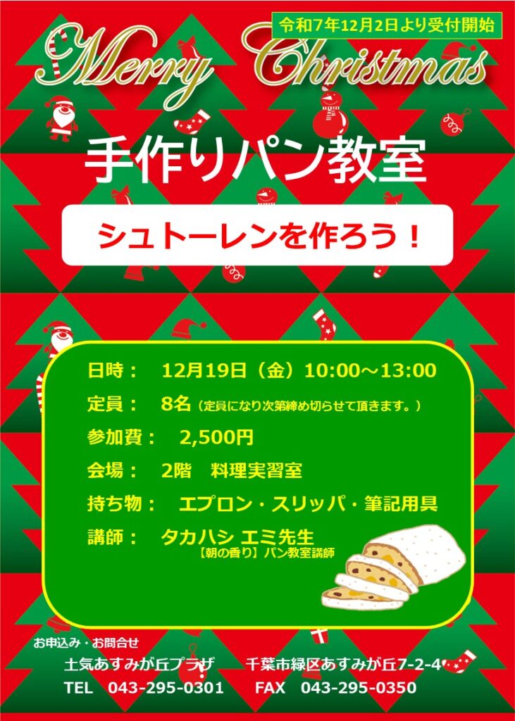 手作りパン教室 (令和7年12月2日より受付開始) 2025年10月28日 最終更新日時 : 2025年10月28日 土気あすみが丘プラザ 未開催 シュトーレンを作ろう! 今年は手作りシュトーレンでクリスマスの訪れを待ってみませんか? 12月19日(金) 10:00~13:00 参加費2,500円 講師は【朝の香り】パン教室のタカハシエミ先生