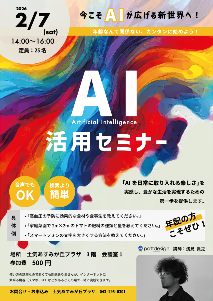 AI活用セミナー 令和8年1月5日より受付開始! 2025年12月21日 最終更新日時 : 2025年12月21日 土気あすみが丘プラザ 未開催 「AIを日常に取り入れる楽しさ」を実感し、豊かな生活を実現するための第一歩!年齢なんて関係ない!カンタンに始めてみませんか? 2月7日(土)14:00~16:00 会議室1 参加費500円