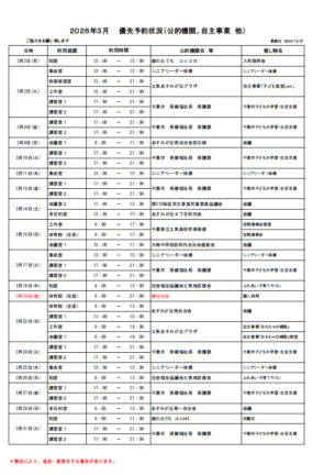 土気あすみが丘プラザ2026年3月の優先予約状況を公開いたします。3月の抽選予約をお申し込みされる際はご確認をお願いいたします。(※更新日現在の優先予約状況となります。特段の事情等により追加、もしくは変更となる場合がござ […]