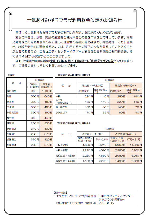 土気あすみが丘プラザ利用料金改定のお知らせ